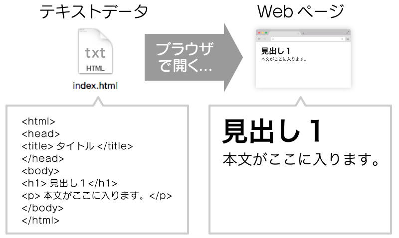 - テキスト、画像、リンク、表などを配置するために、タグを使う。