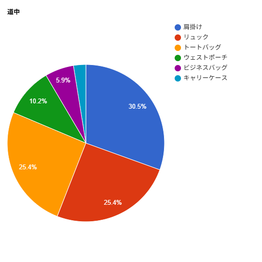 道中では肩掛けカバンが1番多く、次にリュックとトートバッグは同じで、あとはその他という結果になりました。